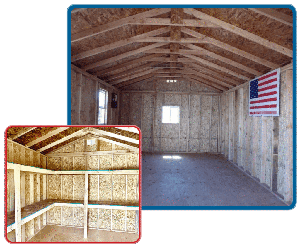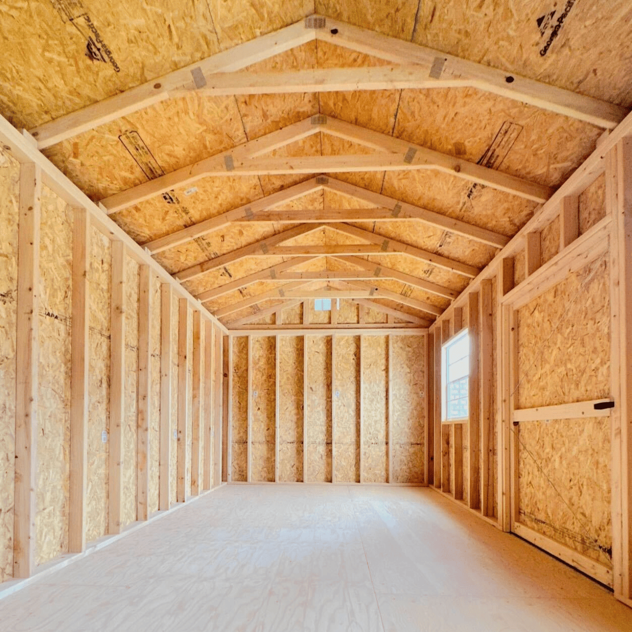 We use 16” spacing on the walls and the floors so your shed is built extra durable! Most builder use 24”!